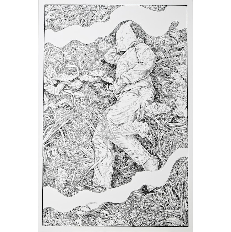 尾花賢一は1981年群馬生まれ。2006年に筑波大学芸術研究科油絵専攻卒業。土地に根差した固有の歴史や物語を背景に、劇画調のドローイングや彫刻、インスタレーションを制作しており、脇役としての覆面男をテーマとしたシリーズは尾花の代表作のひとつだ。芸術祭にも活発に参加し、近年では「奥能登国際芸術祭2020+」(珠洲市、石川)で、新作のインスタレーション《水平線のナミコ》を発表。2021年の「VOCA展」で大賞を受賞したことは記憶に新しい。