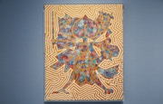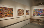 いっぽう、対照的にカラフルな作風の描き手は渡邉あや(1987年新潟県生まれ)。2006年より工房集(埼玉県)に所属。沖縄への修学旅行で飛行機に乗ったことをきっかけに、飛行機を題材に国内外の都市を描くようになったという。ピカソやダリ、サグラダファミリアなど、その国のモチーフをパズルのように構成。水性顔料ボールペンで枠線を描き、色鉛筆でマットに塗り込まれている。見る人の経験が引き出され、作品を通じて会話も弾む。