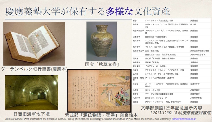 慶應義塾大学は、国宝《秋草文壺》から『グーテンベルク42行聖書』、日吉旧海軍地下壕など、ジャンルも形態も様々な文化資産を有している。その多様さゆえに、活用方法や展示の難しさが長年の課題だった。またその様態が多岐にわたるがゆえに、展示をしてもつながりを見いだせないという問題があった。