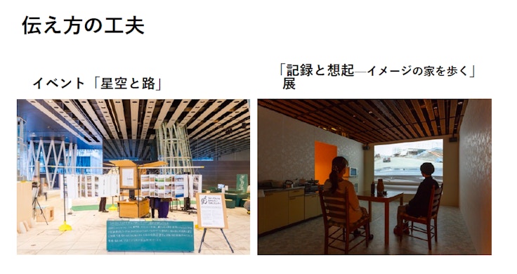 さまざまな活動を資料化するなかで、それをいかに伝えていくか試みの工夫もある。ギャラリーでの展覧会として資料を見せる「記録と想起・イメージの家を歩く」展(2014)や、毎年続けている「星空と路」などだ。