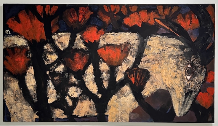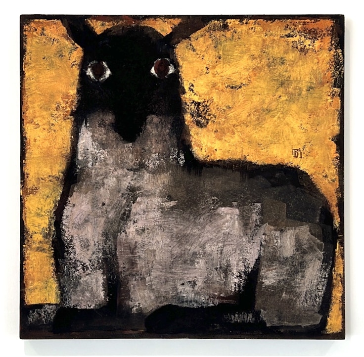 土井は愛知県生まれ。神奈川と東京で育ち、2010年に東北芸術工科大学大学院芸術文化専攻日本画領域を修了。現在は山形を拠点に制作活動している。岩絵具や建築資材、顔料を使って土のような質感で描かれた生物たちは、顔や足が横を向き、体が正面を向く特徴から古代エジプトの壁画を想起させる。また、レンガのような厚みのあるパネルも、作品により土俗的なイメージを持たせている。