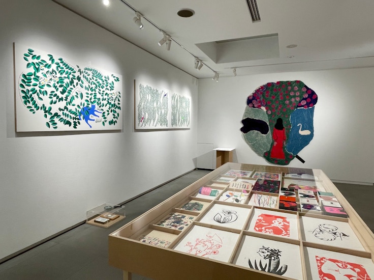 本展ではKIGIとしての活動に加えて、植原と渡邉による個人のアートワークも数多く展示されている。「room C」では、渡邉のボールペン絵が原画となったテキスタイル作品からポスター、ぬいぐるみのデザイン、市原湖畔美術館で開催された展覧会「更級日記考」の出展作品「DANCE」(2019)などが紹介されており、渡邉の特徴とも言える素朴な手描きの風合いが自然と温かみある空間をつくり上げている。