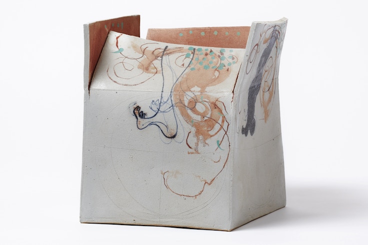 箱の口に動きのあるユニークな造形。入り乱れることを意味する「撩乱」をタイトルとした。白い足と呉須の青い足は女男の別であろうか。入り乱れた箱の動きは、着物の裾がはためく様にも見えてくる