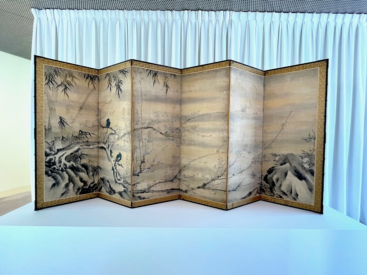 本作は水墨画が隆盛を極めた中国・南宋の時代より数多く描かれたこのモチーフが、室町時代の日本おいて引き継がれたことを示し、屏風というメディアが大陸から日本へともたらされ、独自の発展を遂げていった歴史を来場者に印象づける。屏風発祥の地、中国の上海での展覧会「Paraventi」ともひとつなぎとなった、屏風という文化のダイナミズムが想起される。
