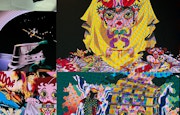 本展のために田名網敬一が制作した屏風《記憶は嘘をつく》(2023)は、屏風の伝統に敬意を払い制作された。屏風に配されたコラージュは、平面的なアメリカのコミックブックや日本のマンガの要素を多分に取り入れており、グラフィック・デザイナーとして日本の紙媒体を舞台に独自の表現を追求してきた田名網の来歴をうかがわせる。同時に、平面が立体化する屏風というメディアは、平面を組み合わせて立体をつくり出す田名網の作品と、極めて相性が良いことも伝わってくる。