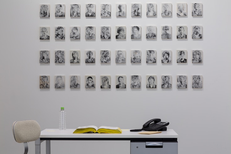 壁面の展示は続く。様々な属性の人たちのポートレイトの連なる一角があって、目を惹く。これらはすべて作家自身の顔写真をもとにつくられたものである。同じ人間が被害者にも加害者にも、どんな立場にもなり得ることを表しているのだろうか。