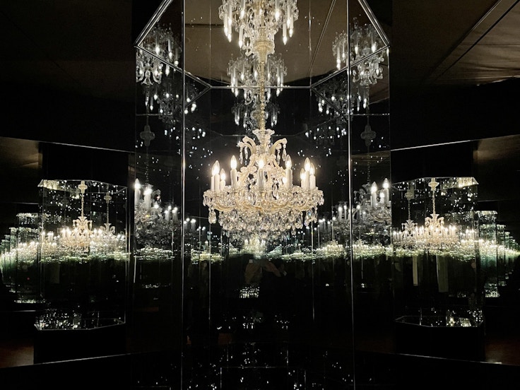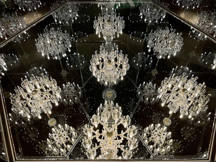 暗い部屋の中央でゆっくりと回転するシャンデリア。展示室を囲む鏡張りの壁には無数のシャンデリアが映り込み、ほのかな光が空間に無限に広がる。
