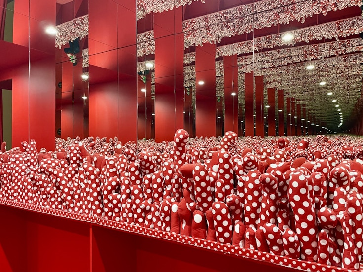 このほか、日本国内では千葉・木更津にある複合施設「KURKKU FIELDS(クルックフィールズ)」で、鏡と自然光だけを使ったミラールームの作品《無限の鏡の間- 心の中の幻》(2018)も常設展示されている。静岡県立美術館にも、単色のライトを使ったミラールーム《水上の蛍》(2000)が収蔵されており、機会があればあわせて見比べるのもオススメだ。