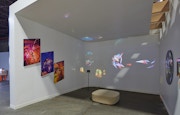 視覚デザイナーでグラフィックアーティストとしても活躍する河野未彩は、多色の影をつくる照明「RGB_Light」で知られる。今回見せる《HUE MOMENTS》(2024)は、「光の三原色」の原理を再解釈したインスタレーション。幅10メートルを超える空間の中に置かれた巨大な構造体にRGBの光源をミックスさせた光を3方向から当てることで、刻一刻と変化する影や色面が生まれる。色相が移り変わる周期はそれぞれの光源で異なり、会期中一度も同じ色が現れることはないという。色の多様性をあたらめて認識させるとともに、この瞬間にしか存在しない色を目撃するという体験が提供されている。
