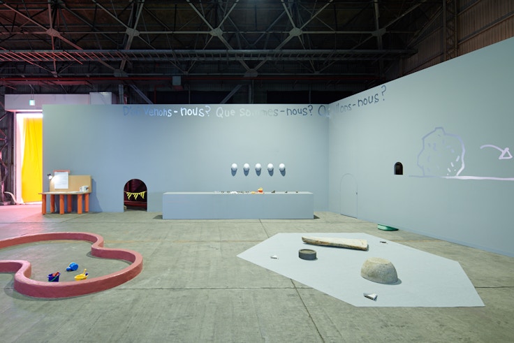 高さ6メートルを超える特徴的な会場は、空間デザイナー・西尾健史が空間設計を、山口萌子がグラフィックと什器デザインを担った。展示スペースは西尾と作家たちがディスカッションを重ねてつくられたもので、各作家ごとに与えられた大きなスペースが特徴だ。