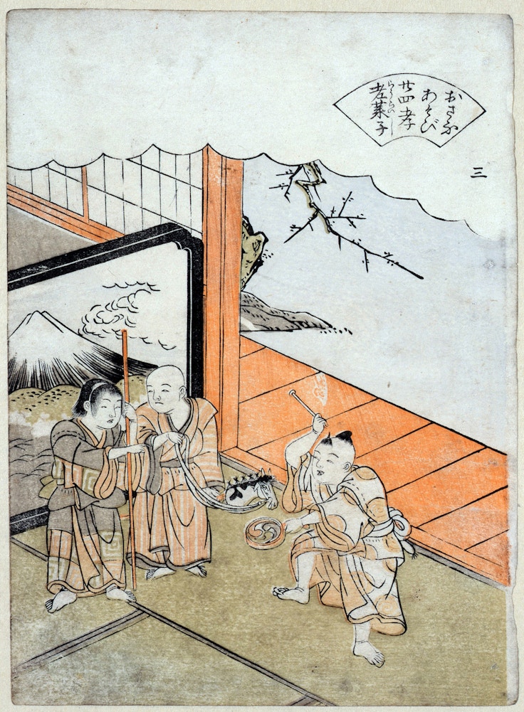江戸時代後期になると、儒教の教えが庶民の生活に浸透し、親しみやすいかたちで広まったことが浮世絵や錦絵に表れている。その代表例が「老莱子(ろうらいし)」のエピソードを描いた錦絵だ。老莱子が親の前で子供のように振る舞い親に年齢を自覚させないことで孝行を示した姿は、ユーモラスな表現として庶民に親しまれ、パロディとしても描かれた。