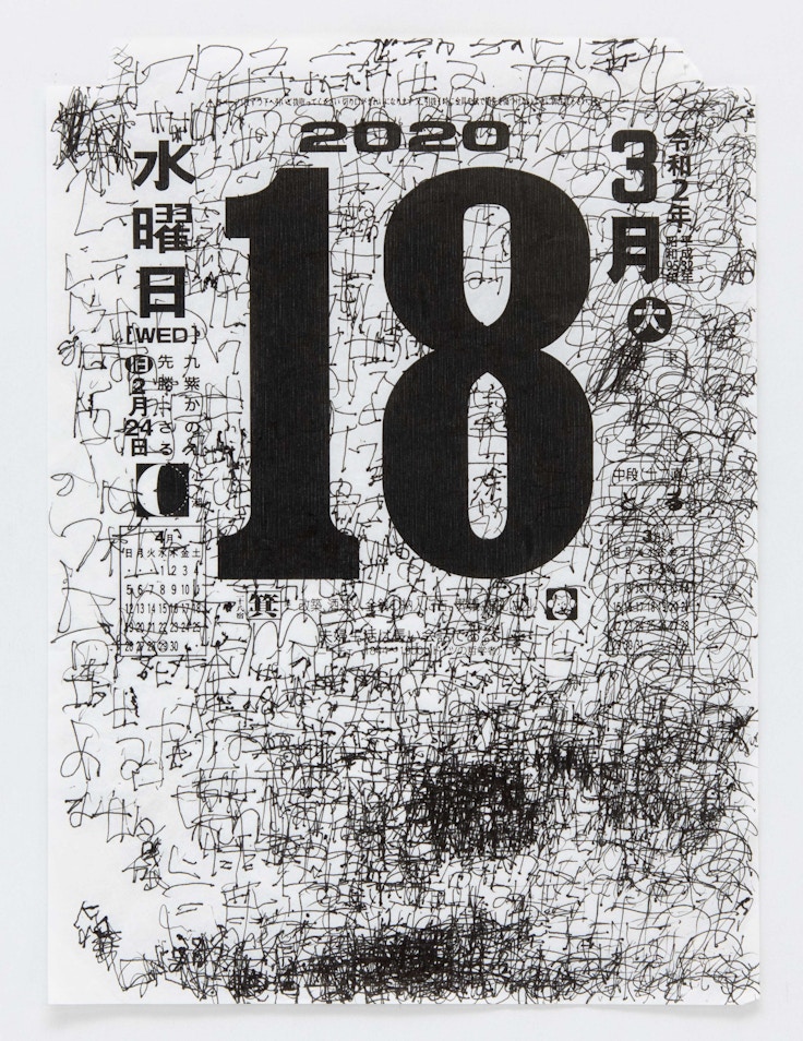 3つめのキーワード「ルーティン」では、「単位」を無数に繰り返すなど、驚くべき集中力で一つひとつの小さな行為の集積によって生まれる、圧倒的な力にフォーカス。ここでは、システマティックな手法で「ドット」を置き続ける森本絵利、世界を「数字」によって把握し書き出す柴田龍平、「釘」を打つことで精神の安寧を求める平田安弘、何かを満たすかのようにカレンダーに「文字」を重ねる松本国三の作品を展示。