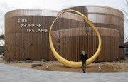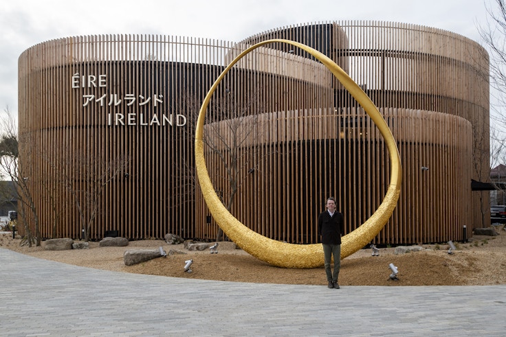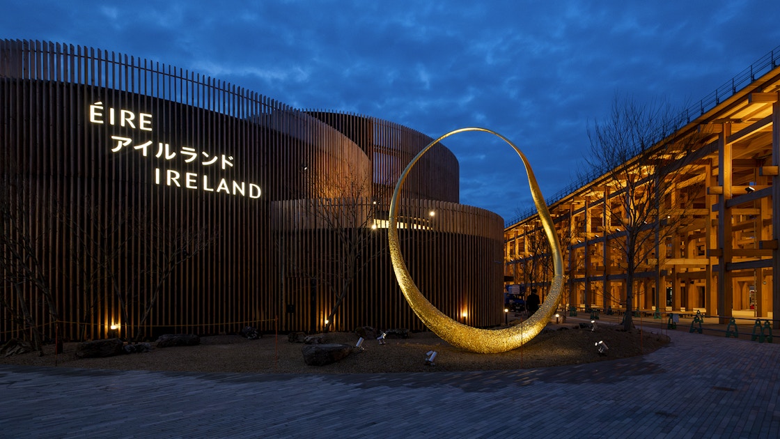 「大阪・関西万博アイルランドパビリオン」(4月13日〜10月13日)でアンバサダーとして抜擢されたウォルシュは、「創造性と人々のつながり」をテーマに、初となる大規模な屋外彫刻《Magnus Rinn》を展示。この作品は、円環の流れるシルエットが特徴的で、ブロンズから木材、金箔へと素材が移り変わり、ウォルシュの手の痕跡を残した質感が、自然と人間の関係を視覚的に表現している。作品全体が金箔で覆われ、木目が金箔の下から浮かび上がるような仕上がりになっており、時の流れと共生の象徴として、アイルランドパビリオンを代表する作品となる。