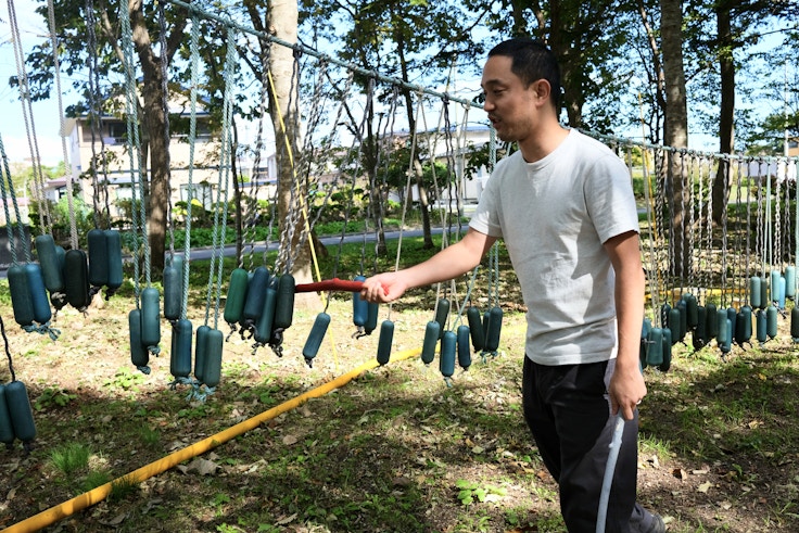そのひとつ、《TSUNAGU – 楽器の秘密基地》は、同コレクティブのメンバーで今年2月に白老へUターンした中谷公祐を中心に、同会社の会長・菱川勢一、サウンドデザイナーの清川進也によって制作された。町内で使われなくなった漁具、工場の端材、海辺の流木などを集め、さまざまな楽器に仕立てた。作品は子育てふれあいセンターすくすく3・9の庭に設置され、子供たちは時間を忘れて遊んでいた。流木のバチで浮きを叩けば予想外の音が響き、形の異なる端材を叩くと音階も生まれ、発見は尽きない。