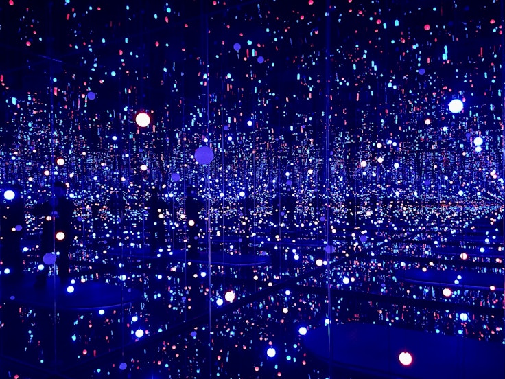 その後、展示室を囲む鏡張りの壁に無数のシャンデリアが映り込む《傷みのシャンデリア》や、草間の代表的な「インフィニティ・ミラールーム」シリーズの《魂の灯》が続き、草間ワールドに迷い込んだようにも感じられるインスタレーションが展開される。暗い部屋のなかに現れる《天国への梯子》を覗き込めば、館内のどこにいるのかわからなくなりそうな無限の空間を感じることができるだろう。また同タイプの黄色いかぼちゃの彫刻のなかでは最大のサイズを誇る《大いなる巨大な南瓜》も紹介されており、草間ならではの独創的な世界観が立ち現れる。