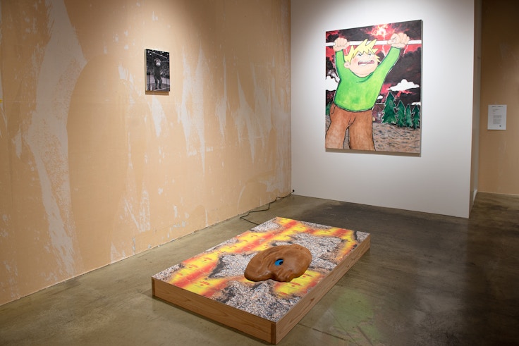 会場一番奥の空間で、間取り図を模したペインティングと、建物の屋内を映し出すCG映像とを組み合わせたインスタレーション作品《掘削かてい》を発表した菅野歩美は、「オルタナティブ・フォークロア」をテーマに制作を続ける現代美術作家だ。土地にまつわる物語や伝説、幽霊譚など「フォークロア」と呼ばれるものに対して、なぜ人々によってそれらが紡がれてきたのか、その背後の歴史や個人の感情を想像することで生まれる「オルタナティブ・フォークロア」を映像インスタレーションに表現している。作品のモチーフは、菅野の祖父が廃業した事務所。整理の過程で着想を得たという本作は、「むかしむかし」から始まる語りとともに事務所内を巡る映像を通して、モノの配置や間取りといった記憶の曖昧さや揺らぎを表現している。