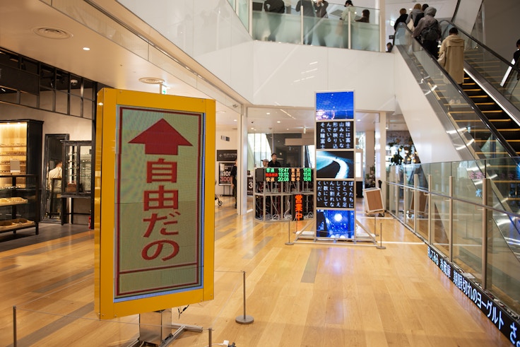 PARCO MUSEUM TOKYOを出て4階アトリウムに向かうと、今枝祐人による《インワード・フェイシング・アウトワード》が展示されている。短歌や詩などの言語表現をもとにインスタレーション作品を制作する今枝は、都市の日常に溶け込む電光掲示板を用いて、自身の言葉や映像を街へと持ち出す行為をかたちにした。内なる言葉(Inword)を外部(Outward)に向けて解放し、社会との新たな接点を生み出す試みでもあると作者は説明する。