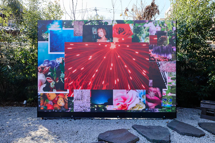 さらに展示は庭へと続く。植栽の手前には大きなスクリーンが設置されており、スライド式に写真作品が延々と映し出されている。その写真は数千枚にのぼり、上映は約30分にも及ぶ。時刻や気候によって、その見え方は刻々と変わっていきそうだ。訪れたのは早春のうららかな日和で、陽光のなか蜷川実花の鮮やかな花々の写真を眺めるのは新鮮な体験だった。