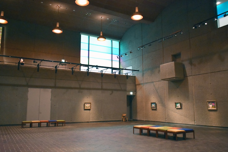 会場となるのは東京都美術館の地下に広がる吹き抜けの大空間(ギャラリーA〜C)だ。ここはかつて「彫塑室」と呼ばれ、2012年のリニューアル前までは三方向の窓から光が差し込んでいた場所。いまもなお、タイルの床やコンクリートを削った壁など、前川國男による建築独特の質感と佇まいを維持している。