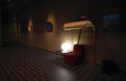 吹き抜け空間の隣にあるギャラリーBでは、発泡スチロールやスポンジといったありふれた素材で展示室にさりげない「しつらえ」を施し、天井高の低い空間を”杉戸色”へと変貌させている。