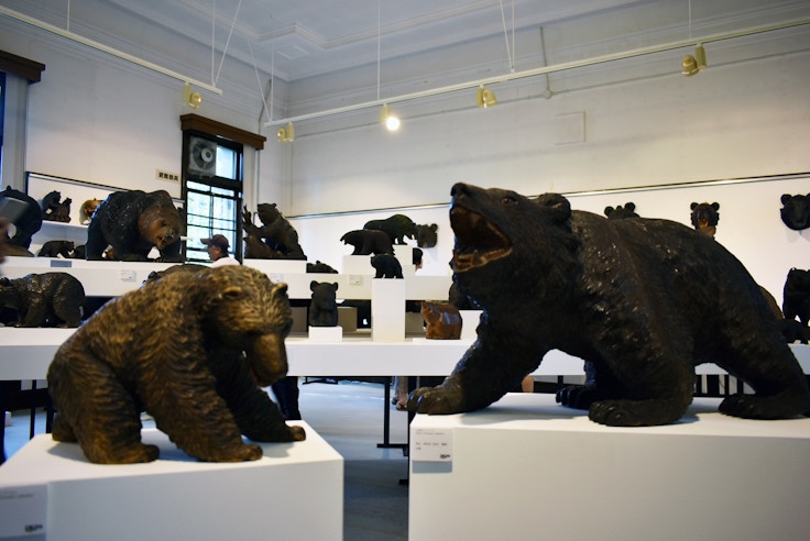 「北海道の三至宝:アートはこれを超えられるか!」で注目したいのは、約200体以上の木彫りの熊が集合した「北海道の木彫り熊〜山里稔コレクションを中心に」だろう。かつては北海道の土産物の定番だった木彫りの熊。これは農民が冬季に副収入を得るために盛んにつくられたものだが、近年はその需要が減っているのが現状だ。ここでは造形作家でランドスケープデザイナー・山里稔が収集した木彫り熊を中心に、道内コレクターから借りてきたという熊の数々をあわせて展示。木彫りの熊を通して北海道の歴史を俯瞰する。