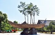 建畠が今回の「アジア回廊 現代美術展」のシンボルとも言うべき作品であると話すのが、ツァイ・グオチャン(蔡國強)の《盆栽の舟》(2017)だ。二の丸御殿の庭に突如として出現する巨大な木造の船。これは、ツァイが16年の「東アジア文化都市2016奈良市」で東大寺の池に設置した木造船を二条城に移設したもの。舟を鉢に見立て、5本の松の大木が植えられたこの作品は、それ全体が盆栽を表している。東アジア全体の文化交流を示しながらも、「東アジア文化都市自体も、ただの飾り物、一夜城にすぎない」という皮肉が込められているとツァイは話す。