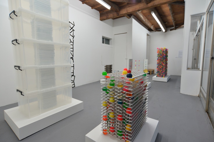また街中のガレージでは、他人のヘッドフォンやイヤホンの音漏れに合わせてダンスをするパフォーマンスを記録した小山友也の《Dancing by myself》を展示。ボタンギャラリーでは、身の回りにある日用品を組み合わせて彫刻作品をつくり上げる冨井大裕が代表作品である「ball sheet ball」シリーズの最新作を見せる。