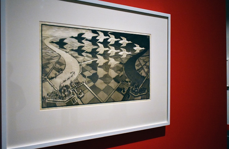 この作品について、本展監修を務める東京藝術大学大学美術館准教授・熊澤弘は「エッシャーのエッセンスが端的に現れており、バックグラウンドを色濃く反映している作品」だと語る。エッシャーは1924年の結婚後、ローマを拠点に作品を制作していた時期があった。しかし、イタリアでファシズムが隆盛を見せると、それに抵抗するように36年には同地を離れ、フランス、そしてスペインへと船旅に出る。その道中、スペインのアルハンブラ宮殿を訪れたエッシャーは、建物の幾何学的なタイル模様に影響を受け、平面を同じ図形で埋めていく「正則分割」を作品に取り込んでいく。《メタモルフォーゼII》はまさにこの正則分割の賜物であり、ダイナミックなモチーフの変容は、観るものを飽きさせない。
