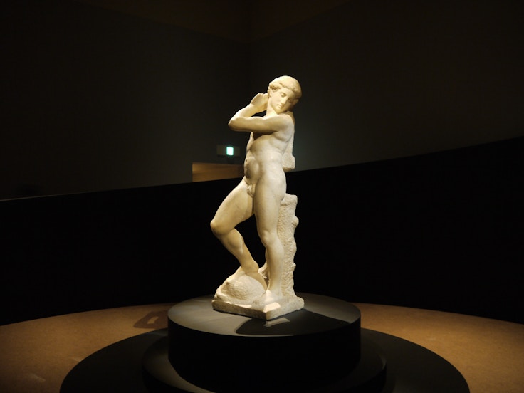 また、本作は見る角度によって見えてくる印象が次々と変化する。体をしなやかに湾曲させて片足に重心をかけるという古代ギリシャ彫刻で典型的なポーズ、高く突き出した右膝に目を奪われるダイナミックなポーズ、さらには見る角度を変えると、身体全体が大きくのけぞっているということや、あるいは頭からつま先までが螺旋を描いているようにすら見える。本展では、その引き締まった身体と気品ある表情の同作を360度見ることが可能だ。一面からではなく様々な角度からじっくりと鑑賞し、ミケランジェロがたどり着いた身体表現の極地を味わいたい。