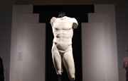 なかでも注目したいのが、《アメルングの運動選手》(紀元前1世紀、フィレンツェ国立考古学博物館蔵)だ。アスリートの表現はギリシャ彫刻のなかでも重要視されており、人体表現の規範はアスリートによって確立された。手足と首がないトルソーの状態で現存している本作は、同じような形態の彫刻の断片が見つかっているため全体の姿を予測することができるという。古代ギリシャでは神に捧げる儀式だったというオリンピック競技で活躍した選手がモデルになったのかもしれない。