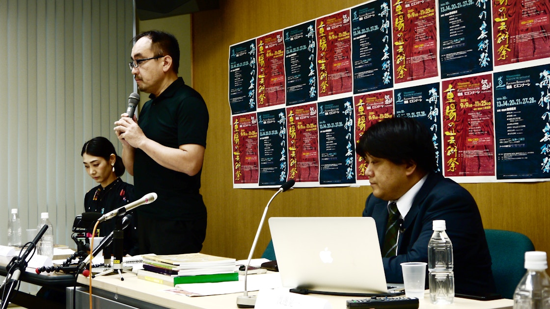ヤノベは今回、「《サン・チャイルド》の経緯を説明したかった」として記者会見に参加。会見では福島ビエンナーレの概要説明とともに、ヤノベによる《サン・チャイルド》設置と撤去の経緯、今後のことが語られた。