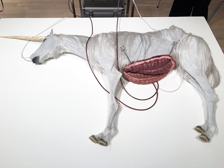 「蘇生」では架空の存在であるユニコーンをつくり続けてきた平野真美の作品がまず目を引く。台の上に横たわるユニコーンの腹部はわずかに上下し、そこにある存在がつくりものであることを一瞬忘れさせる。4年にわたりユニコーンの骨格、筋肉、皮膚、そして内臓をつくってきた平野。その状態は死に向かっているように見えるが実際は逆だ。《蘇生するユニコーン》というタイトル通り、完成時には腹部も縫合され、より「実在」に近い存在として完成。人工呼吸と血液循環によって蘇生措置を施されたユニコーンが誕生する。