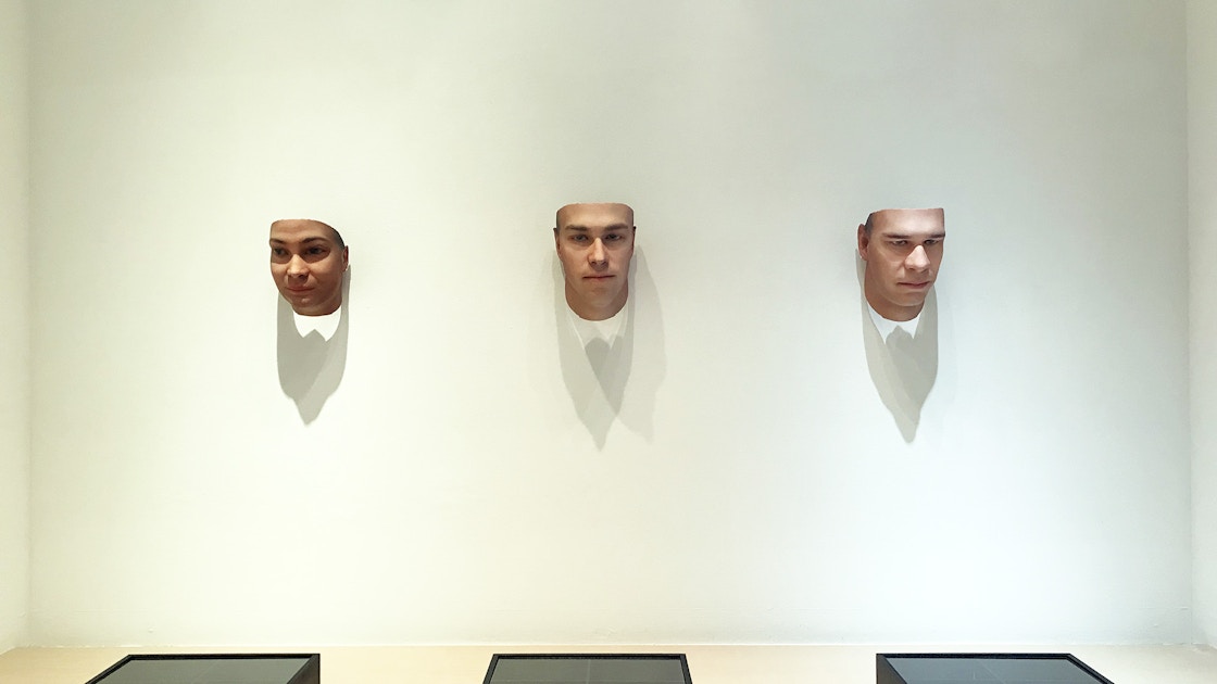 壁に掛けられた3つの人間の顔。これらは道ばたに落ちていた髪の毛やタバコから採取されたDNAをもとに、その落とし主の顔を再現したもの。ヘザー・デューイ・ハグボーグの《ストレンジャー・ヴィジョンズ》は、DNAによる監視の危険性を強烈なビジュアルで示す。