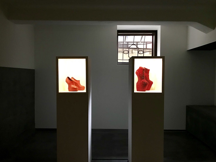 代表作である「ヒールレスシューズ」のシリーズが展示されているのはもちろんだが、京都の香老舗・松栄堂とコラボレーションした本展では「源氏香の図」と呼ばれる紋様をモチーフとした新作群も発表している。