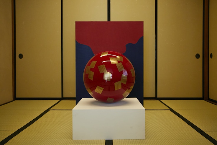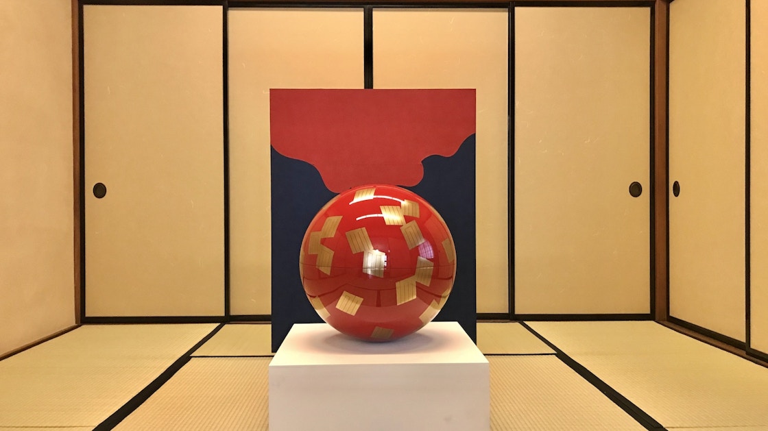 また、同じく「源氏香の図」を蒔絵によって球体に描いた香炉《源氏香の図 蒔絵香炉》も本展のための新作だ。本展の中心的存在となっているこの作品は、石川県輪島市の伝統工芸士が仕上げを担当。和室の中で存在感を放っている。