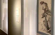 長沢芦雪の章では、アメリカのエツコ&ジョー・プライスコレクションから来日した《白象黒牛図屏風》(18世紀)や《猛虎図》が並ぶ。ここでの「初」は《猿猴弄柿図(えんこうろうしず)》(18世紀、個人蔵)だ。同作は915(大正4)年の売立目録(カタログ)に掲載されていたもので、今回の調査で再発見された。柿を抱え込んだ岩の上の大きな猿と、岩をよじ登ろうとする子猿。猿を擬人化したような、その滑稽な表情に注目してほしい。