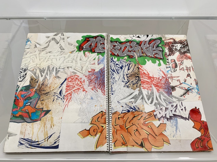 会場には、大山が高校卒業時にプロポーザル(申請)を通して校内のコンクリート壁に制作した絵画作品《慶應義塾志木高等学校 壁画》(2003)の関連資料や、高校〜大学時代に制作したドローイングをまとめたスケッチブック、さらに2009年の修了制作展で制作したアクリルボックスを使った《FFIGURATI #9》(2009)などを展示。大山の「クイックターン・ストラクチャー」形成と発展の歴史を垣間見ることができる。