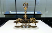 煌煌とした金色が目を引く《金銅密教法具》は、金剛盤の上に五鈷鈴と五鈷杵を据えた密教法具のセット。密教ではこうした組法具が修法壇に置かれたが、この法具は、空海が中国から帰国するに際し、師の恵果が授けた法具類の一部と考えられたものだという。空海請来の霊物として尊崇され、現在もなお、大阿闍梨の道具として重要視されている。