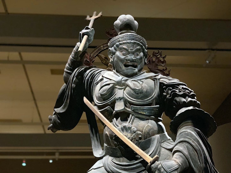 東京国立博物館 特別展室長の丸山士郎が「精悍な顔立ちが人気を呼んできました」と話す《帝釈天騎象像》や、「表現の頂点とでも言えるような恐ろしい表情が特徴」と言う《持国天立像》など、様々な角度からその表情と造形を眺めたい国宝が勢揃いする会場は、壮観な眺めとなっている。