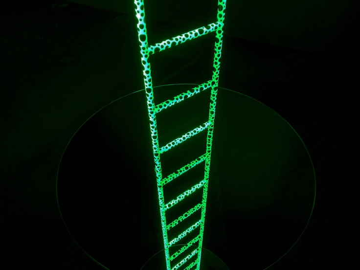 本作は、上下2枚の円形の鏡に色が変化するハシゴが挟まれており、合わせ鏡の効果によって無限にハシゴが伸びているかのように見える。「永遠の無限」という本展のタイトルに呼応するような作品。