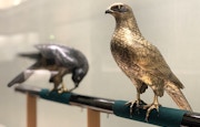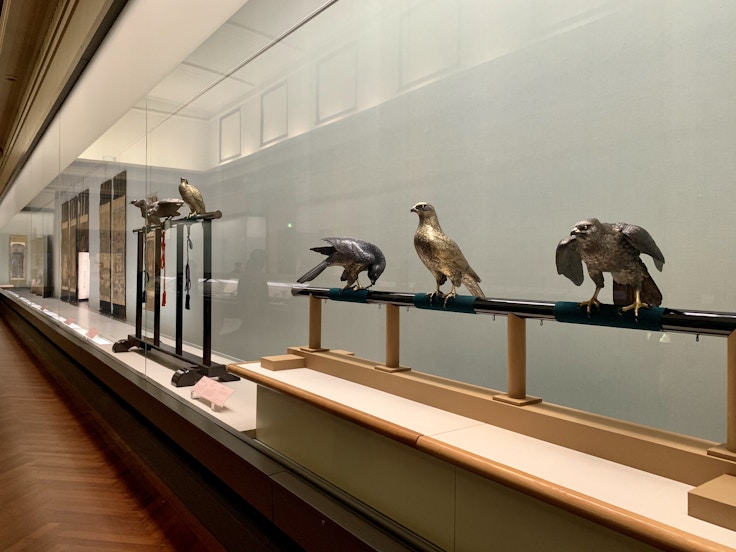 工芸品の部からは、鈴木長吉作の銅置物《十二の鷹》に目を凝らしたい。その名の通り、12羽の鷹からなる本作は、明治時代、シカゴ万博に出品されたもので、鈴木長吉の作品としては2件目の重文指定。真鍮の上から彫金し、羽根や表情を彫り表しており、高度な金工技術が見て取れる。
