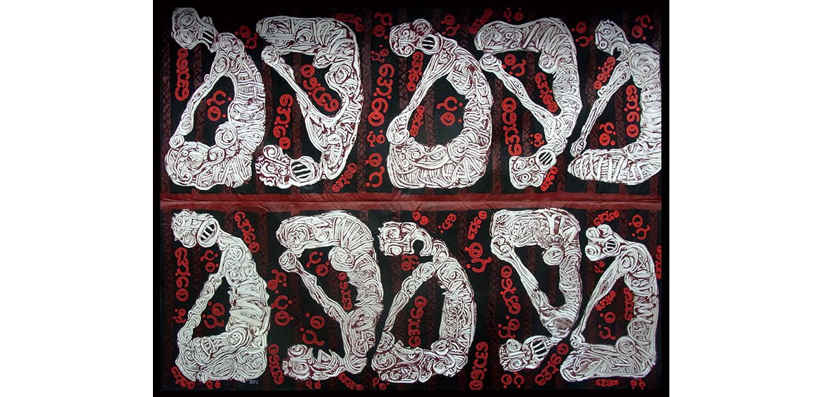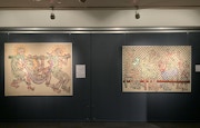 ティン・リンは1966年ミャンマー生まれ。88年に民主化運動に参加し、98年に政治犯として投獄。独房の中で、極限的で不自由な状況下で囚人服の上に指や注射器などを使って約300点の反政府的な絵画を制作したという。本展では、ティン・リンが囚人時代に制作した絵画やその思いを叩きつけた作品を含む「囚人シリーズ」と、ミャンマーにおける男女差別の問題に注目した最新作「ロンジー・プロジェクト」を展示している。