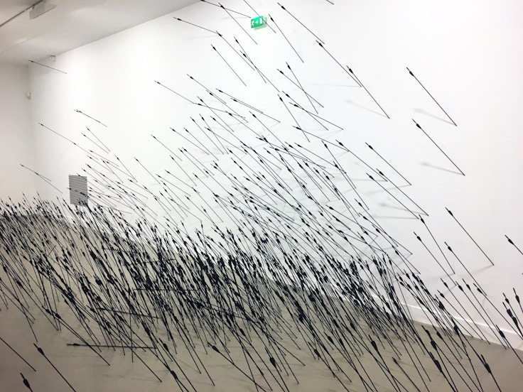 改装された洋館のミニマルな空間の連なりのなかで、ライアン・ガンダー、マルセル・ブロータス、フェリックス・ゴンザレス=トレスの平面や立体作品が順番に鑑賞者を迎える。斜線を描く大量の矢、イニシャル、2つの電球などの曖昧な象徴を、作品タイトルや美術史、アーティストの略歴などから解いていく。