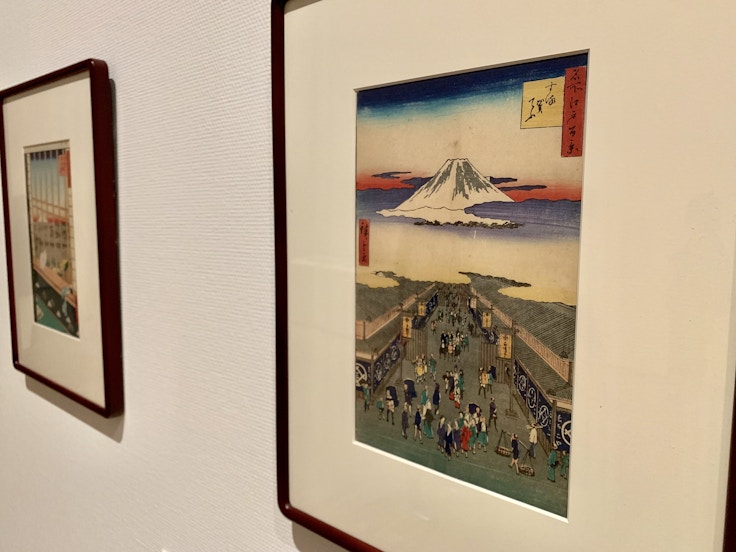 続く2章のテーマは、様々な空間表現や構図、形のないものを図案化する際の斬新なアイデアが光る浮世絵版画が集まる「浮世絵版画のデザイン力」。八木は本章で、当時西洋になかった描画技法として3つのことを挙げる。まずは、陰影やグラデーションとして用いるのではなく、ひとつの「色」として確立して用いた木版画の黒色。次に、西洋の線遠近法とは異なる独自の構図だ。「町を見下ろす視点、そして遠くに見える山とがユニークな構図で描かれた《名所江戸百景 する賀てふ》(1856)をはじめ、独特の遠近法に注目してほしいです」と八木は話す。