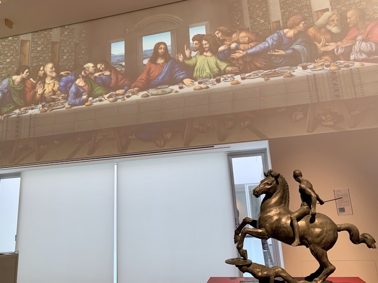 もっとも注目したいのは、ダ・ヴィンチ唯一の現存壁画《最後の晩餐》を復元したものだ。ダ・ヴィンチが1495年から98年にかけて制作した本作は、ミラノのサンタ・マリア・デッレ・グラーツィエ修道院の食堂壁面に描かれたもので、制作直後から顔料層の剥離が起き、加えて壁画裏にある厨房の湿気によって発生したカビが何世紀も真っ黒に覆っていたという。ナポレオンによる占領時代や第二次世界大戦を経て、本作は1999年より、20年にわたる修復が行われたが、現在でもかなりの部分が剥離した状態となっている。