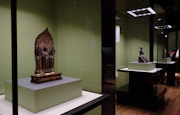 《如来および両脇侍立像》(6〜7世紀)は、中央の如来の左右に脇侍菩薩が立ち並ぶ、一光三尊像。近年の科学調査により、如来部分は朝鮮半島、両側の脇侍は日本でつくられた可能性が高いとされた。仏教の伝来における大陸との関係性がうかがえる仏像だ。