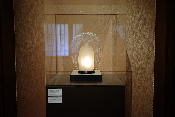 ラリックをはじめとするアール・デコ様式は、大正から昭和にかけて日本の皇族にも愛されたが、その先鞭をつけたのが朝香宮鳩彦王夫妻だ。パリ滞在時に訪れた「アール・デコ博覧会」(1925)を見物して強い感銘を受けた夫妻により、アール・デコ様式をふんだんに取り入れて建てられたのが、現在の東京都庭園美術館である旧朝香宮邸。正面玄関の扉のガラスレリーフや、大客間の天井灯は、ラリックの手によるものだ。