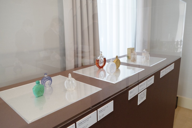 ラリックがガラス工芸家として名をなすきっかけとなったのが、香水商フランソワ・コティとの出会いだった。コティの注文によってラリックが瓶やラベルをデザインした香水は、多くの人気を集めて、その名声を高めた。当時の香水瓶の複雑な装飾からは、気泡が入らないようにガラスにプレスをして紋様をつけるなど、その人気を下支えした高い技術がうかがえる。