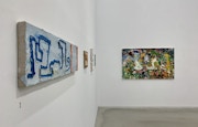 既存の日本画の枠組みから逸脱する作品を数多く手がける三瀬。本展では、巨大な作品に別の作品を掛けたり、空いた穴から別の作品が見えたりと、視点を固定させない空間を構成した。