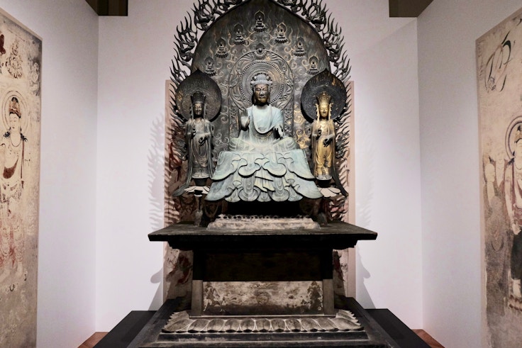 また、「スーパークローン文化財」によって制作された、釈迦三尊像や金堂壁画も展示。スーパークローン文化財は、最新のデジタル技術と、高度な専門性を有したアナログ技術を融合させた、東京藝術大学の独自の文化財複製技術。これにより制作された、釈迦三尊像や金堂壁画も、貴重な研究資料として展示される。